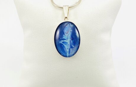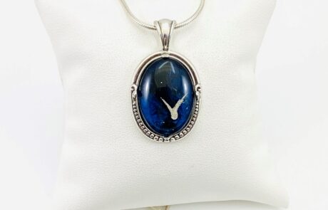 The hand-painted glass stone, or semi-precious natural stone that you select will be professionally set in you’re the pendant mounting that you choose from a wide choice of design styles and materials. Our pendants hold 3 sizes of stones: 1” round, ¾” round, and 1” x ¾” oval.
